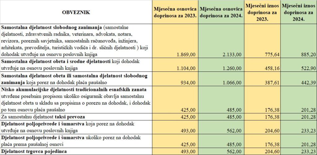 Detaljne iznose uplate doprinosa za pojedine djelatnosti, možete pogledati u sljedećoj tabeli: